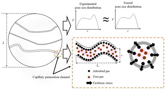 In order to construct an adsorption model that can reasonably and accurately describe the adsorption process of gas in coal seams, this article proposes a new fractal capillary bundle model. This model introduces the concept of fictitious stress based on molecular dynamics theory [] and discusses how parameters such as tortuosity fractal dimension, capillary fractal dimension, and fictitious stress affect pore structure and gas adsorption capacity. This model differs from conventional gas adsorption models by incorporating the concept of virtual stress to explain how key parameters, such as rock porosity and permeability, change during the adsorption process. It specifically focuses on the adsorption behavior of gas in rocks, providing a more comprehensive understanding of the underlying mechanisms.