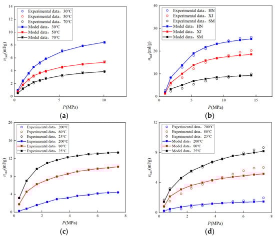 The existing experimental data on coalbed methane adsorption capacity were fitted by adjusting the curvature fractal dimension Dt and the capillary fractal dimension Dg [,,,,,,,,,]. The fundamental parameters used in this analysis are summarized in Table 2, and the corresponding fitting results are presented in Figure 2. The model fitting effect (R2) is shown in Table 3.