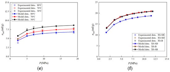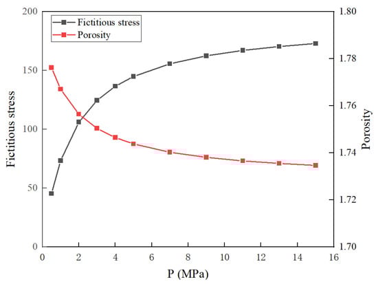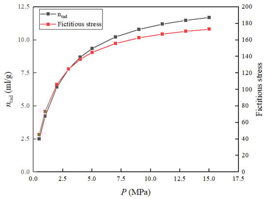 Fictitious stress is entirely generated by gas adsorption, so its variation with pressure closely follows the trend of gas adsorption (Figure 6). However, under high-pressure conditions, the curves for fictitious stress and gas adsorption diverge. This difference is primarily due to the significant variation in the V0 parameter used in the virtual stress calculation at high pressure compared to standard conditions. As fictitious stress increases, the pore structure of the coal seam undergoes changes, which in turn affects its gas adsorption capacity. Previous gas adsorption models assume that the maximum adsorption capacity of the coal seam is constant, which introduces errors when predicting its gas adsorption capacity [,,].