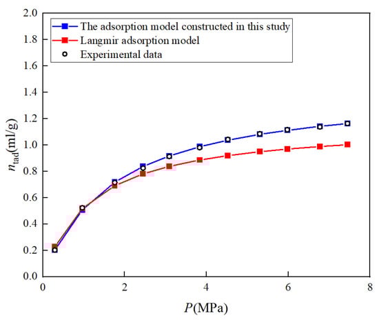 When comparing the new adsorption model with the commonly used Langmuir adsorption model, the newly established gas adsorption model (R2 = 0.999) has a higher degree of fit compared to the Langmir adsorption model (R2 = 0.789) in Figure 7.