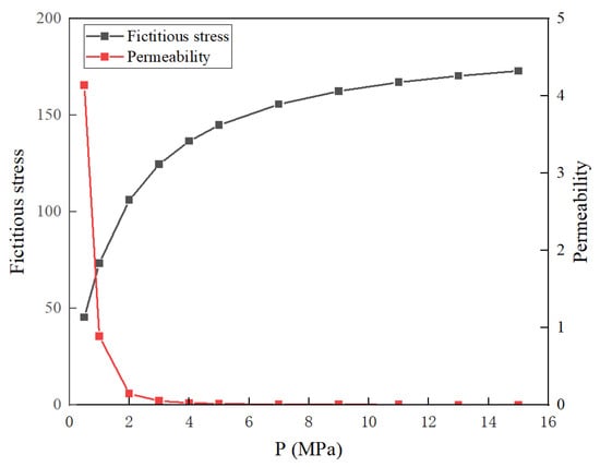 By introducing virtual stress, the changes in pore and permeability characteristics of the coal seam during gas adsorption can be directly expressed (Figure 8 and Figure 9). Under pressure, the trends of virtual stress variation are accompanied by a 2.3% reduction in porosity and a 99.92% reduction in permeability. This indicates that gas adsorption primarily impacts the gas flow process within the coal seam.