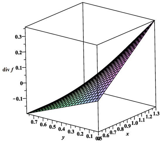 Then, the divergence of the vector field f will change its sign in the simply connected region. If condition (12) is violated, then the divergence retains its sign. Using the visualization tools of the Maple computer mathematics environment, we will construct an example of a simply connected region in which changes in the signs of the parameter values are performed, that is, the conditions of Theorem 2 are satisfied (Figure 1): .