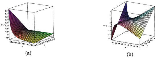 Figure 3 shows examples of simply connected regions in which the divergence of the vector field changes its sign: Figure 3a is the accumulation rate function (13), and Figure 3b is the accumulation rate function (14).