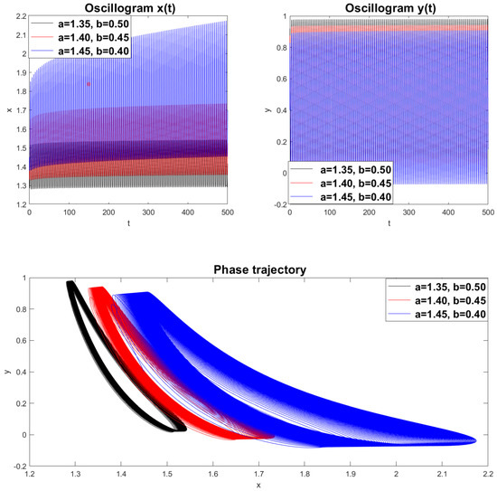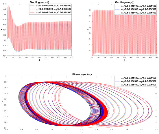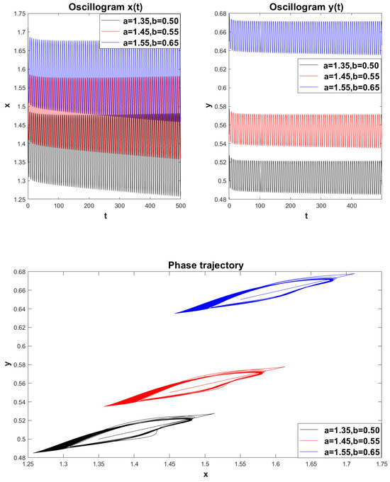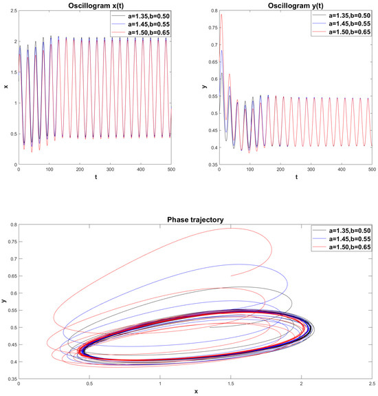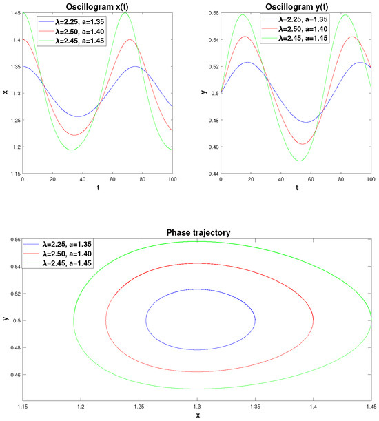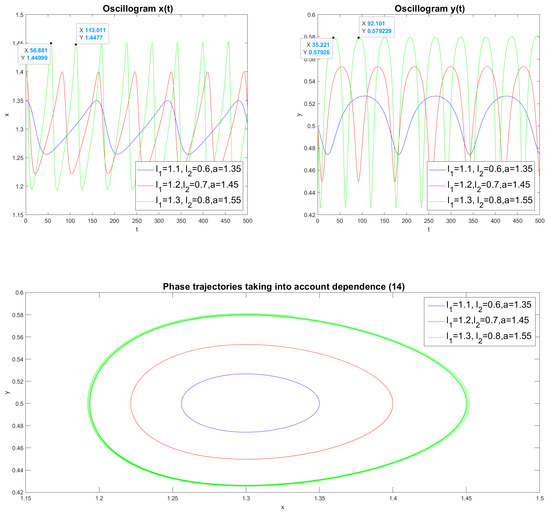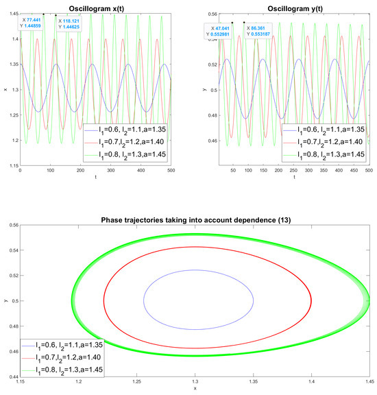 The theorem indicates that the classical mathematical model of S.V. Dubovsky (10) can be suitable for studying cyclical regimes that can arise in the theory of economic cycles and crises. Let us construct oscillograms and phase trajectories for the classical model of S.V. Dubovsky for different values of the initial conditions a and parameter (Figure 2). For this purpose, we will use the one-step Adams–Bashforth–Moulton method (ABM) of the second order of convergence (trapezoidal rule) [55], which was implemented in the MATLAB computer algebra system.