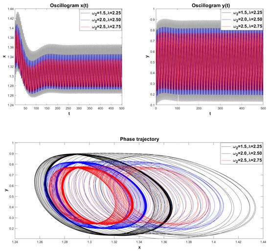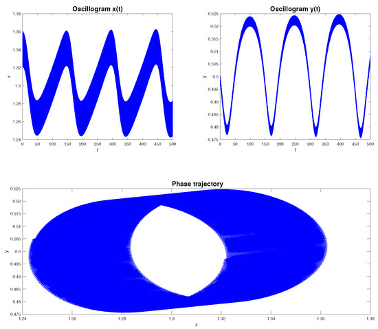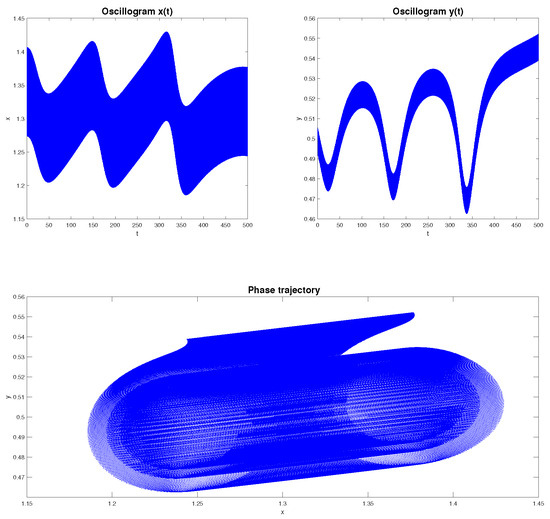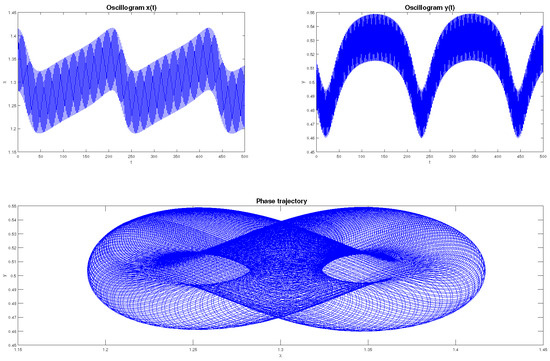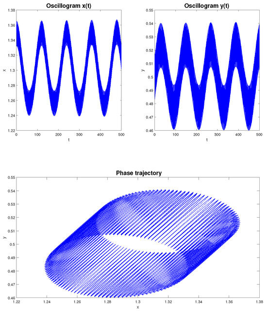 Figure 6 shows an example of constructing oscillograms and a phase trajectory obtained with the following parameter values: , , , . Note that the phase trajectory is closed; in addition, it experiences oscillations due to external harmonic functions.