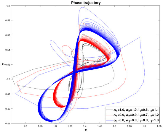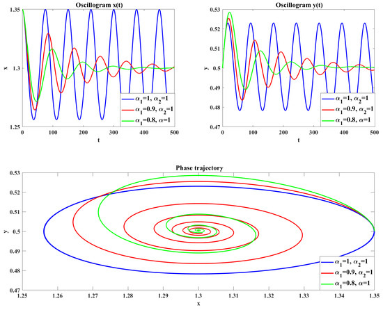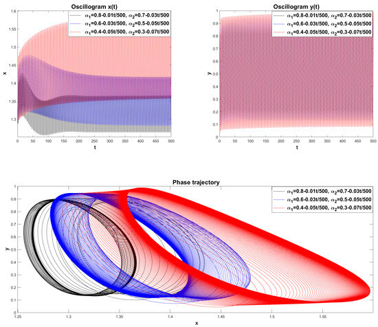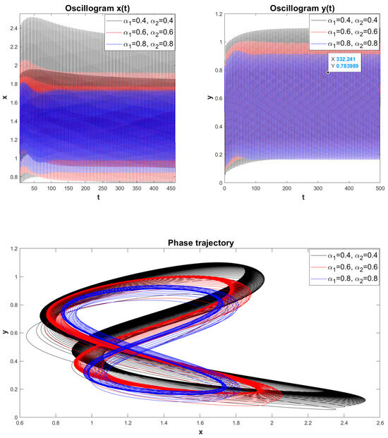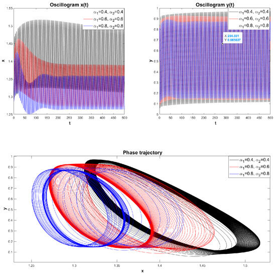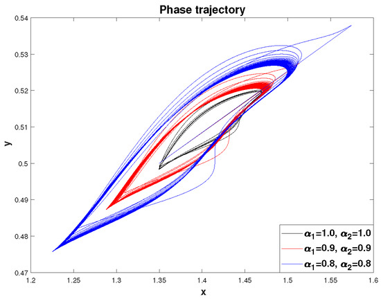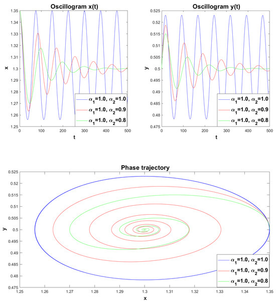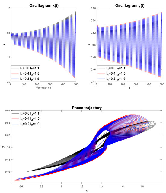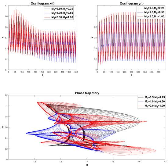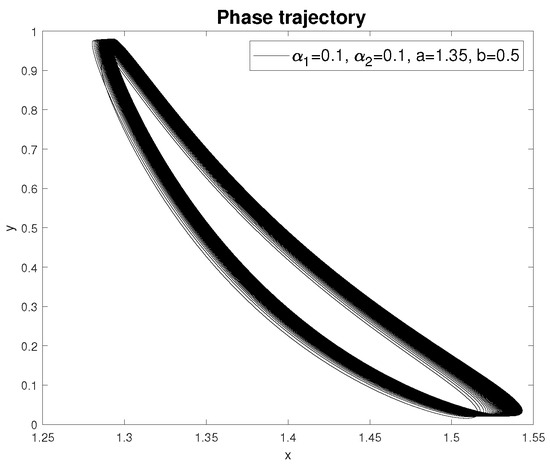 We will seek a solution to problem (15) using the numerical one-step Adams–Bashforth–Moulton method of the second order of convergence (trapezoidal method). The phase trajectories obtained according to the numerical method for model (15) are shown in Figure 4 taking into account dependencies (13).