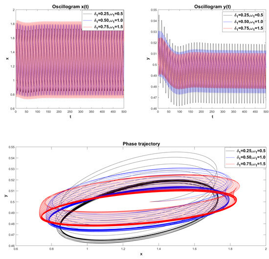 In our work we will consider the harmonic functions and in model (16), where and are amplitudes, and and are frequencies. The choice of such dependencies is due to the fact that the influx of external investments and new technologies is periodic. In addition, such dependences lead to the occurrence of resonance effects in the oscillatory system, which is of great practical importance. In this work, we will demonstrate these properties using computer simulation.
