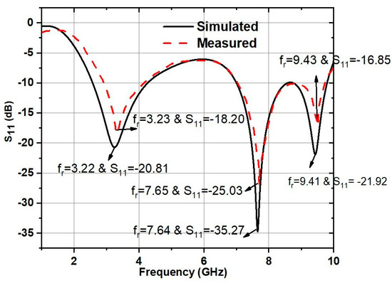 | [18] | 40 × 34 × 1.6 | FR-4 | 2.26–4.10 6.0–9.82 | 2.8 3.51 6.53 9.37 | 2.1–9.37 |