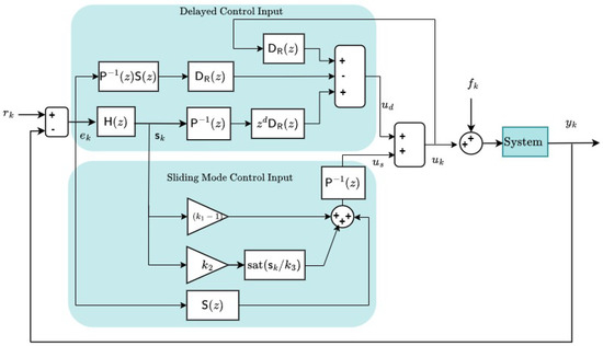 In order to address the second limitation of general RC, an integrated sliding mode controller (SMC) is utilized to ensure robustness in the presence of model uncertainties. SMC is a widely recognized control scheme that operates on the principle of switching control and attempts to steer a sliding function in the direction of a designated sliding surface. A discrete-time SMC has been widely exploited in much of the literature [26,27,28,29,30,31,32], and here, the discrete-time SMC with a linear switching function will be incorporated into the FD-RC. Numerous research studies have been conducted on the utilization of sliding mode control with a supplementary control scheme, such as repetitive control, as reported in [33,34,35,36,37,38]. In [33], a repetitive sliding mode controller incorporating an exponential-based bi-power reaching law for three-phase voltage source inverters was introduced. An integral sliding mode control scheme based on repetitive control was developed in [34] for uncertain repetitive processes with the presence of matched uncertainties, external disturbances, and norm-bounded nonlinearities. A repetitive sliding mode controller with a modified RC was designed in [35] for uncertain linear systems. An adaptive smooth second-order sliding mode repetitive control method for a class of nonlinear systems with unknown disturbances and uncertainties was proposed [36]. In [37], a discrete-time low-order sliding mode repetitive controller was presented for a class of uncertain linear systems affected by band-limited periodic disturbances and parametric uncertainties. Lu et al. [38] presented an enhanced sliding-mode repetitive learning control scheme using the wavelet transform, which speeds up the learning process.