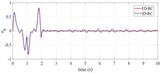 In the meantime, Figure 16 illustrates the robustness performance of FD-RC and ID-RC systems. As shown in Figure 16a,c,e, FD-RC is capable of maintaining system stability with a 20% increase in parameter variation. When the variation reaches 30%, however, the error response slowly diverges, indicating that the system output becomes unstable. The worst robust performance is given by the ID-RC system as indicated in Figure 16b,d,f. The ID-RC system remains stable at a 10% variation; however, the steady-state error significantly degrades in comparison to the nominal case. Then, the system output becomes unstable when the variation reaches 20%, as indicated by the error response rapidly diverging to relatively large values. The magnitude of the error divergence increases when the variation reaches 30%.