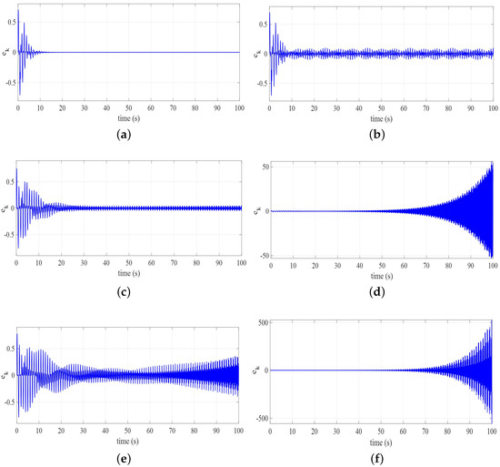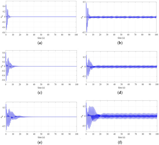 The tracking errors of the ID-RSMC system under parameter variations are presented in Figure 15b,d,f, demonstrating a similar trend to that of the FD-RSMC case, particularly in the stability of a closed-loop system. However, in contrast to the FD-RSMC case, the steady-state error of the ID-RSMC system is amplified as the variation grows. Therefore, increasing parameter variation in the ID-RSMC system considerably degrades tracking accuracy, especially in the steady-state period.