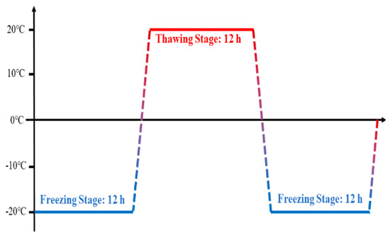 Figure 1 shows the distribution of average minimum temperatures in SRM sampling area from 2019 to 2021. As shown, the average minimum temperatures from November to April during this period were consistently below 0 °C, with the lowest monthly average reaching −20 °C. In contrast, the average minimum temperatures in other months remained above 0 °C, indicating the presence of F–T cycles in the sampling area. Due to the specific environmental conditions of SRM, the F–T tests were conducted using air freezing and air thawing, with freezing and thawing carried out in a low-temperature chamber and a drying oven, respectively. Based on previous F–T studies of SRM, the freezing temperature and duration were set to −20 °C and 12 h, respectively, while the thawing temperature and duration were set to 20 °C and 12 h. The number of F–T cycles was determined with reference to the design service life of the waste dump, which was 13 years, and was therefore set to 15 cycles. F–T tests were conducted for 0, 5, 10, and 15 cycles. A schematic diagram of the F–T cycle is shown in Figure 2.