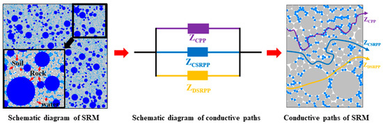 The conductive path model is an equivalent circuit model constructed based on EIS results, which interprets the microscopic structure of porous geotechnical media through characteristic parameters of different conductive paths [27,28,29]. Building on existing studies of conductive path models for SRM, this study classifies the conductive paths within SRM based on particle contacts into three types: continuous pore water conductive paths (), discontinuous soil–rock–pore water conductive paths (), and continuous soil–rock–gas pore conductive paths (), as illustrated in Figure 4. As shown, the conductive paths within SRM are arranged in parallel. Based on Ohm’s law [27,28,29], the impedance of different conductive path models can be calculated as follows: