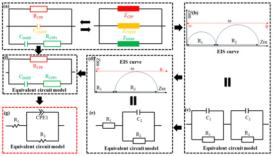 Based on previous studies of EIS [26,28], it is observed that the impedance response of different conductive-path equivalent models for SRM (Figure 5a) typically exhibited a two-semicircle arc pattern (Figure 5b). However, this response can also be represented by conventional electrochemical equivalent circuit models (Figure 5c). In this study, the impedance expressions of both the conductive-path equivalent models of SRM and the traditional electrochemical circuit models are derived. Through simplification and comparison, the characteristic parameters corresponding to the different conductive paths in the electrochemical equivalent model are obtained, with their calculation expressions given as follows: