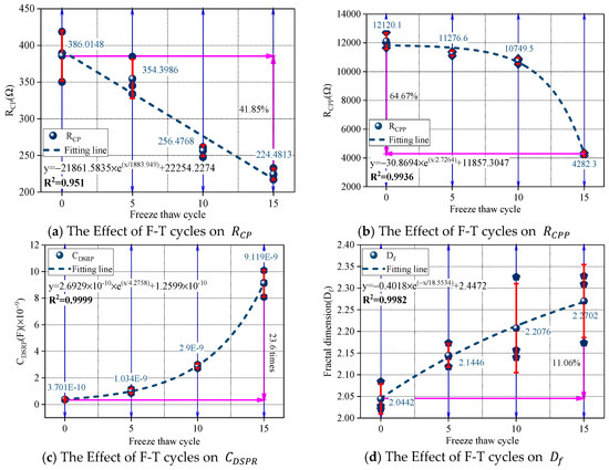 Figure 6 presents the influence of F–T cycles on the characteristic parameters of different conductive-path equivalent models of SRM. As shown in Figure 6a, when the number of cycles increases from 0 to 15, the value of decreases from 386.0148 Ω to 224.4813 Ω, corresponding to a reduction of 41.85%. Moreover, exhibits a clear exponential relationship with the number of cycles, with a fitting coefficient of 0.951. Figure 6b illustrates the evolution of under different F–T cycles. With increasing cycles, decreases from 12,120.1 Ω to 7837.8 Ω, representing a reduction of 64.67%. Similarly, an exponential relationship is observed, with a fitting coefficient of 0.9936. According to Figure 6c, as the number of F–T cycles increases from 0 to 15, increases from 3.7005×10−10 F to 9.1189×10−9 F, showing a growth factor of 23.6. The relationship between and F–T cycles also follows a clear exponential trend, with an excellent fitting coefficient of 0.9999. Figure 6d shows the effect of F–T cycles on the fractal dimension of the soil–rock cementation interface. As the number of cycles increases from 0 to 15, the fractal dimension rises from 2.0442 to 2.2702, corresponding to an increase of 11.06%. This parameter also exhibits an exponential relationship with the number of cycles, with a fitting coefficient of 0.9982.