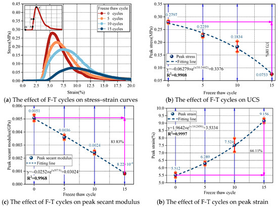 Figure 7a presents the stress–strain curves of SRM under varying numbers of F–T cycles. The curves exhibit four distinct stages: micropore compaction (OA), elastic deformation (AB), plastic deformation (BC), and post-peak softening (After point C). With an increase in cycles from 0 to 15, the compaction stage becomes more pronounced, while both peak stress and peak strain show contrasting trends, with peak stress decreasing and peak strain increasing. In addition, the elastic deformation stage becomes progressively less distinct. To facilitate the quantification of SRM deformability, the peak secant modulus was adopted as the representative parameter. Figure 7b illustrates the variation in UCS with increasing cycles. The UCS decreases from 0.2797 MPa at 0 cycles to 0.0753 MPa at 15 cycles, corresponding to a reduction of 373.08%. The relationship follows a clear exponential decay, with a fitting correlation coefficient of 0.9908. Figure 7c shows the evolution of the peak secant modulus under repeated F–T cycles. As the number of cycles increases from 0 to 15, the modulus decreases from 0.0051 GPa to 8.22 × 10−2 GPa, representing an 83.83% reduction. The relationship also follows an exponential law, with an excellent fitting correlation coefficient of 0.9968. Figure 7d depicts the evolution of peak strain with increasing F–T cycles. The peak strain increases from 5.512% to 9.156% as the number of cycles increases from 0 to 15, representing an increase of 66.11%. This trend also follows an exponential relationship, with a correlation coefficient of 0.9997.