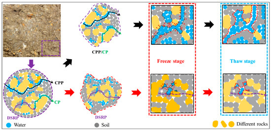 Soil–rock mixtures (SRM) are loose geotechnical materials widely distributed in open-pit mine waste dumps, highway embankment slopes, and slopes in special geological settings. They are primarily composed of fine-grained soil particles, coarse rock fragments, and porosity filled with air or water [1,2,3]. Due to the unique composition of SRM, their microscopic structure and macroscopic mechanical behavior cannot be directly compared with soils or rocks. Previous studies have shown that geotechnical engineering in cold regions was subjected to complex freeze–thaw (F–T) processes, making stability analyses in such regions significantly different from those in temperate areas [4,5,6,7,8]. Repeated F–T cycles gradually damage the initial microscopic structure of soil and rock units, alter their mechanical properties, and ultimately lead to instability and failure of geotechnical structures [9,10,11,12]. Nevertheless, as a complex porous geotechnical medium, SRM are also subject to repeated freezing and thawing, which progressively alters both their microscopic structure and macroscopic parameters, ultimately affecting engineering stability [9,10,11,12]. Therefore, investigating the evolutionary patterns of SRM microscopic structure and macroscopic properties under F–T cycles, elucidating the mechanisms by which F–T processes influence these characteristics, and analyzing the intrinsic correlations between microscopic structure and macroscopic mechanical behavior are of critical significance for stability assessment and the prevention of F–T failures in geotechnical engineering of cold regions.