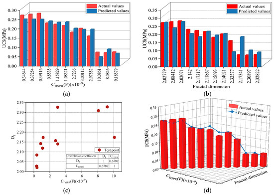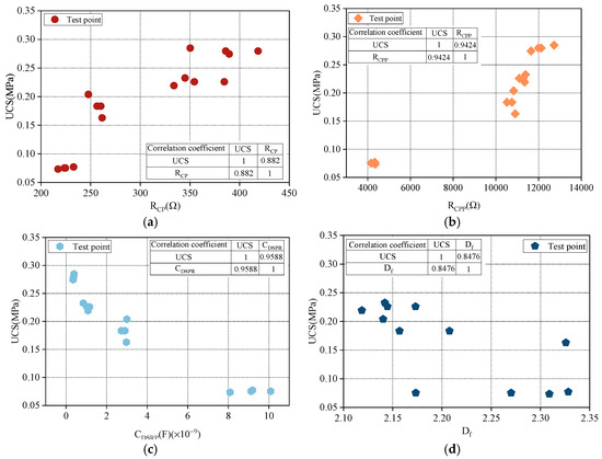 Calculation results of the correlation coefficient between UCS and microscopic parameters for SRM. (a) Calculation results of the correlation coefficient between UCS and RCP; (b) Calculation results of the correlation coefficient between UCS and RCPP; (c) Calculation results of the correlation coefficient between UCS and CDSRP; (d) Calculation results of the correlation coefficient between UCS and Df.