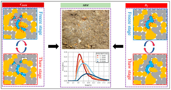 Figure 11 illustrates the relationship between CDSRP, Df, and the mechanical properties of SRM. Combining this schematic with the above regression analysis reveals that increases in CDSRP and Df due to F–T cycles degrade the UCS of SRM. When the number of cycles increases from 0 to 15, repeated freezing and thawing cause the expansion and interconnection of liquid-phase pores of different radii within , as well as an increase in the soil–rock cementation contact area and enhancement of the double-layer capacitance effect, resulting in an increase in CDSRP.