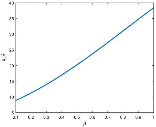 Finally, we visualize the solutions and UH stability features of (14) (see Figure 2) and simultaneously present the variation patterns of the error between the approximate solution and the exact solution as the fractional order β increases (see Figure 3). In Figure 2, Curves , , , and overlap each other. Curves and , as well as curves and , are close to each other. Figure 3 shows that the error increases as fractional order β increases.