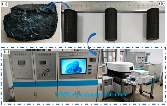 NMR experiment flowchart. (a) Coal blocks collected from underground coal mines; (b) Drilled coal pillars; (c) NMR experimental instruments.
