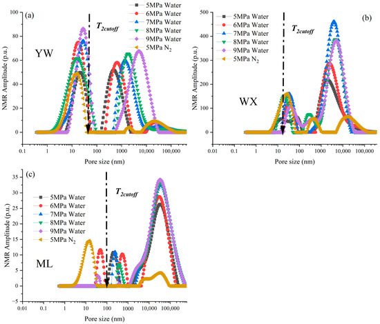 It can be seen that the NMR amplitude rises with the increase in water injection pressure, which significantly increases the fluid filling of small pores. High-pressure water injection mainly affects the nanoscale pores, and the difference in amplitude response of YW, WX, and ML is attributed to different pore size distributions.