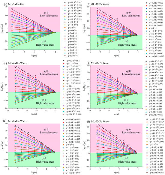 Double logarithmic curves of X(q, ɛ) and ɛ for the coal sample ML. (a) ML-5MPa Gas; (b) ML-5MPa Water; (c) ML-6MPa Water; (d) ML-7MPa Water; (e) ML-8MPa Water; (f) ML-9MPa Water.