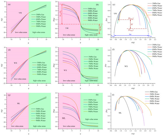 The curvature of the coal samples increases sequentially with increasing water-driven pressure, suggesting that the increase in localized pore size distribution non-uniformity leads to an increase in pressure [2,17]. ML in the region of q > 0, the curve keeps moving downward with increasing pressure, showing that the heterogeneity of the pore distribution is weaker in the high probability region [10,21]. The curvature of the coal samples decreases sequentially as the water-driven pressure increases, demonstrating that the increase in the non-uniformity of the local pore size distribution leads to a decrease in the pressure [12], reflecting the transport process of water in the coal [30]. In the low probability interval of q < 0, the curve of ML with increasing pressure shifts upward continuously, implying that the heterogeneity of the pore distribution in the low probability region of ML is enhanced with increasing pressure [17,25,30].