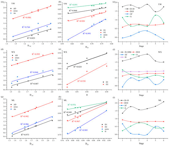 The relationship between multiple fractal parameters. (a), (d), (g) show the relationships between the multifractal parameters ΔD, αmax, and Δα versus D-10 for coal samples YW, WX, and ML, respectively; (b), (e), (h) show the relationships between the multifractal parameters D1, D2, αmin, and H versus D10 for coal samples YW, WX, and ML, respectively; (c), (f), (i) show the variation curves of multifractal parameters D-10, D10, Δf, A, and H for coal samples YW, WX, and ML, respectively.