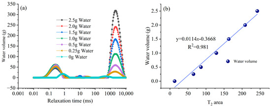 Calibration results for different water qualities. (a) shows the relationship between relaxation time and water volume; (b) indicates the relationship between T2 area and water volume.