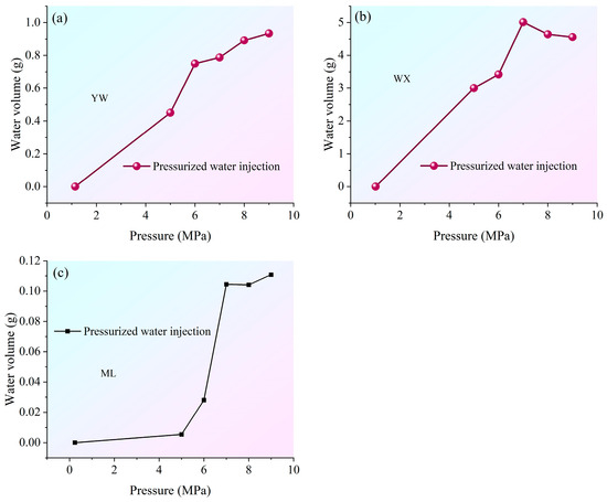 Combining Figure 3 and Figure 8, water enters the micron-scale drainage network at 5 MPa, with a slow increase in water volume between 6 MPa and 7 MPa, and injection into the nanoscale reservoir units only occurs at 8 MPa. This indicates that the nanoscale reservoir units in YW are relatively complex, with high injection resistance, making injection difficult at lower pressures, consistent with the analysis in the preceding text. The micron-scale flow channels of WX and ML are relatively tortuous, with high seepage resistance, causing the flow to be difficult for water to enter micron-scale pore fractures at low pressures. Both WX and ML exhibit a sharp increase in injection volume once pressure reaches 6 MPa, consistent with the multi-fractal parameter analysis of gas–water seepage characteristics discussed earlier. From the injection volume of ML, water has difficulty entering micron-scale pores and can only occupy a small portion of the fractures.