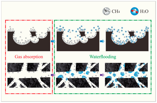 The rational use of water injection technology can not only reduce gas emissions in coal mining to effectively prevent gas outbursts, but also decrease reservoir pressure to promote gas desorption through drainage and gas extraction in the process of coalbed methane (CBM) exploitation and utilization [1,2]. Water molecules in coal seams can affect methane migration through adsorption, desorption, displacement, diffusion, and seepage [3,4,5,6]. From a macro perspective, this manifests as changes in gas and water production, with micro-scale changes appearing as alterations in the flow state of gas and water within pore fractures [7,8]. Analyzing changes in the distribution and flow paths of gas and water in the pores and fractures of coal at the micron-scale can support the selection of appropriate mining techniques and facilitate the efficient utilization and development of CBM [9,10].