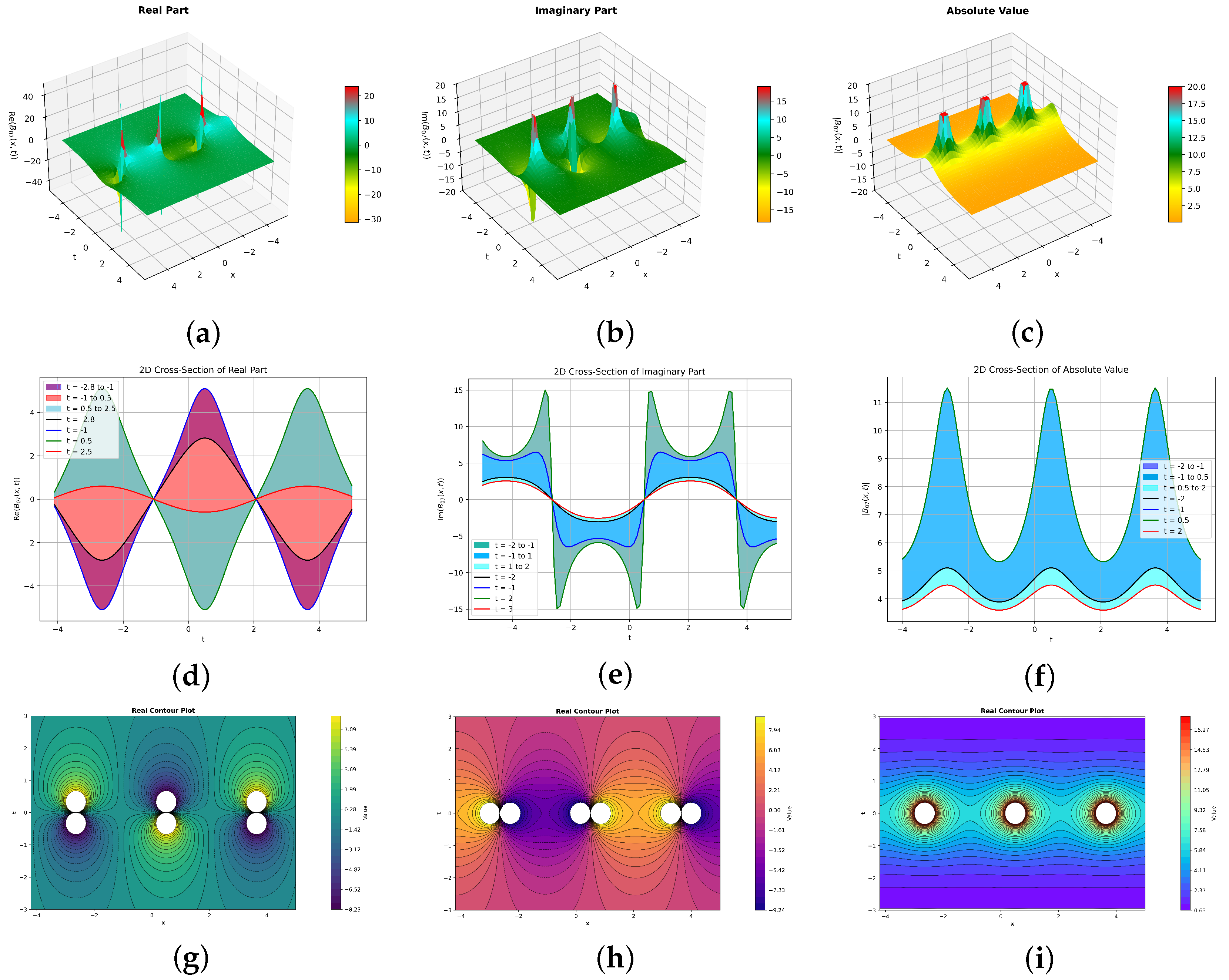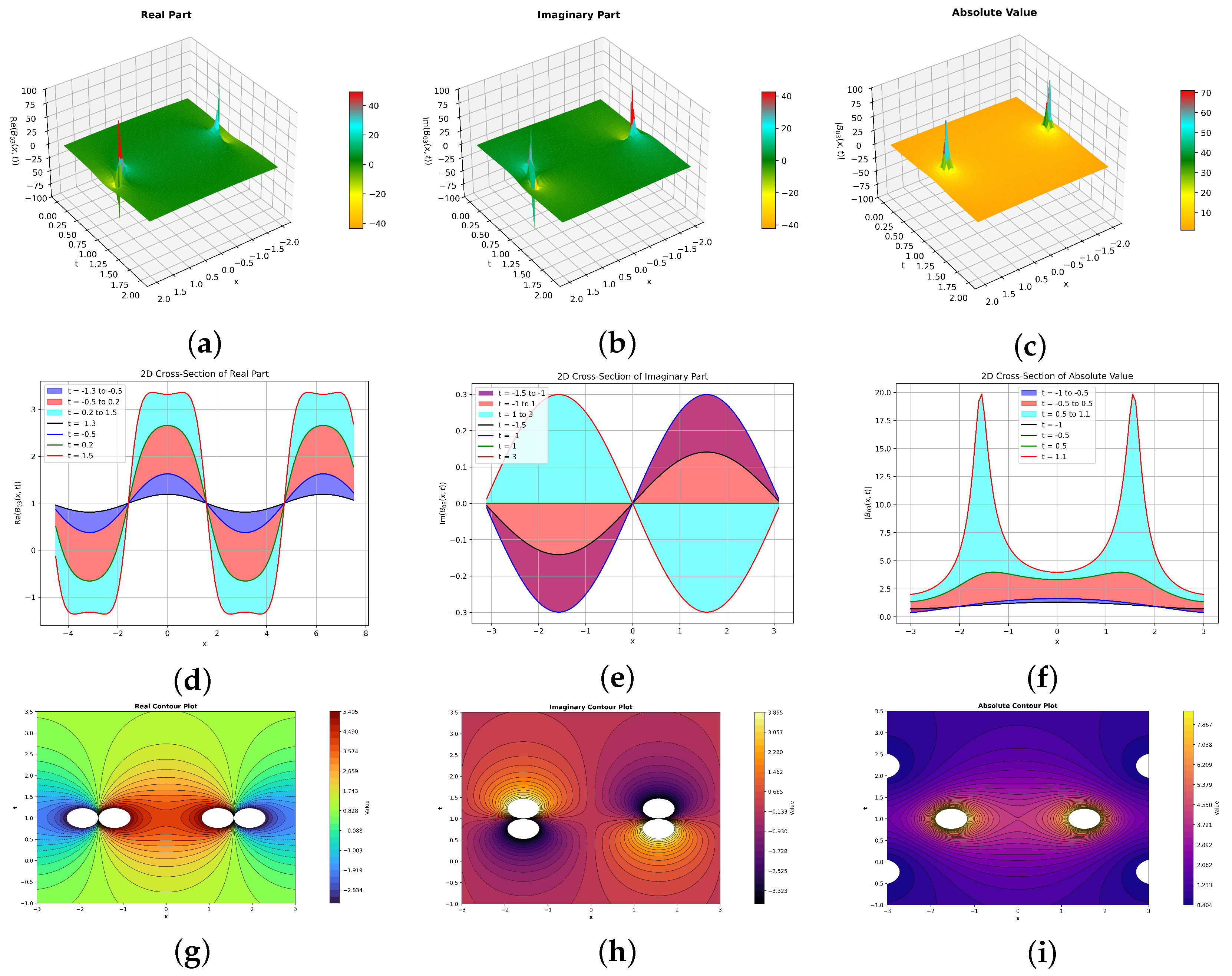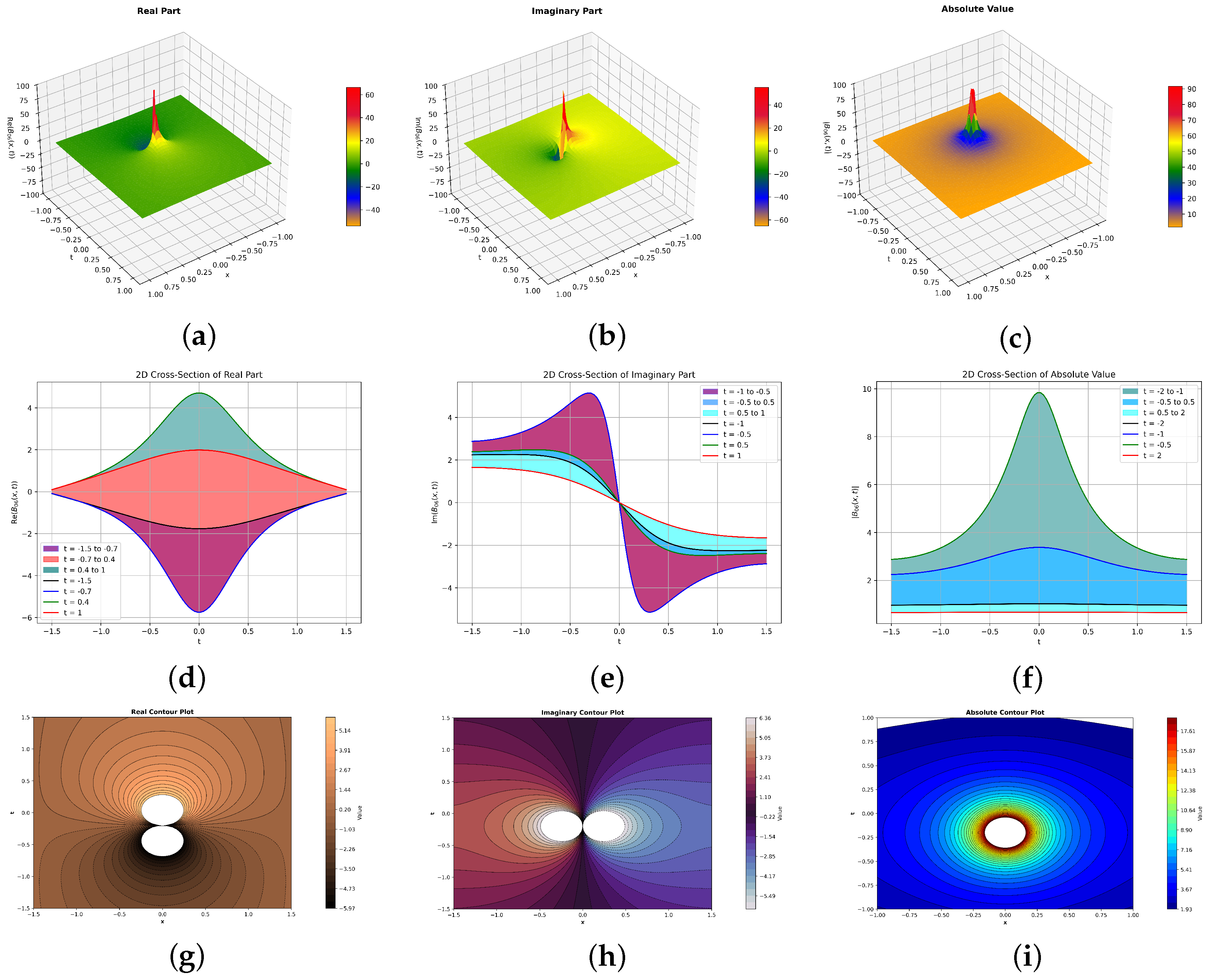 - Farooq, K.; Hussain, E.; Younas, U.; Mukalazi, H.; Khalaf, T.M.; Mutlib, A.; Shah, S.A.A. Exploring the wave’s structures to the nonlinear coupled system arising in surface geometry. Sci. Rep. 2025, 15, 11624. [Google Scholar] [CrossRef]