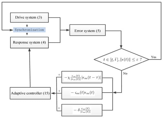 Figure 1 shows the control block diagram between drive system (3) and response system (4). When the error norm does not conform to the synchronization definition, the nonlinear adaptive controller (15) composed of three stacked submodules is applied to the response system. The systems stop external control input when the synchronization goal is achieved.