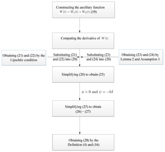 Combining the relevant mathematical formulas, lemmas, and assumptions, Figure 2 shows a schematic diagram of the proof of Theorem 1. It describes the logical derivation relationship of the mathematical expressions (16)–(28). The proof idea is to first construct a positive auxiliary function (19) based on stability theory and solve for the fractional derivative of the function to obtain (20). Using the Lipschitz condition, one can obtain inequalities (21) and (22) and obtain inequalities (23) and (24) based on Lemma 2 and Assumption 1. Then, we substitute (21)–(24) into (20) for simplification and use conditions (16)–(18) and Definition 4 to obtain inequalities (26)–(28).