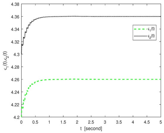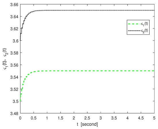 Let parameters , , and . Simple calculations indicate that , , , , and . It is not difficult to find that all the inequality constraints in Theorem 2 are satisfied for the above parameters.