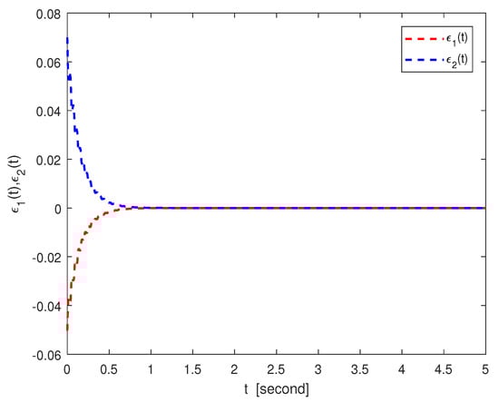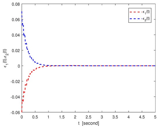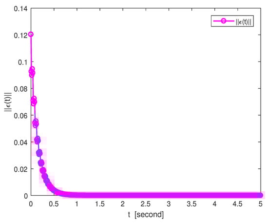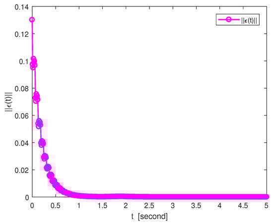 By the nonlinear controller (15), the time evolution of the adaptive control strength is given in Figure 6. Figure 7 shows the system errors of different states under adaptive control schemes, and Figure 8 presents the corresponding norm of the system error. To quantify the variation in the error norm, the time evolution of between systems (41) and (42) is given in Table 6. Obviously, with the advances in control, the controlled master and slave networks (41) and (42) can achieve FT Mittag–Leffler synchronization.