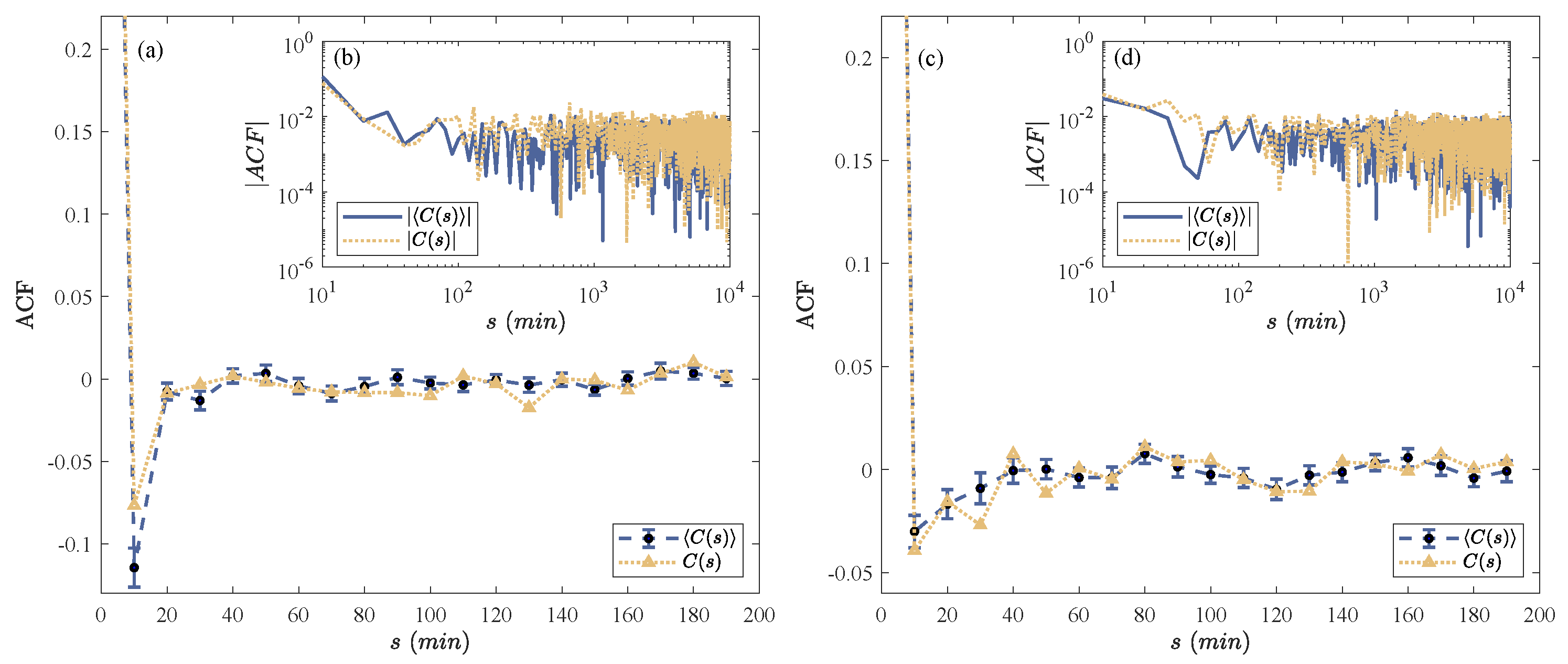 - Autocorrelation Function (ACF)—discrete time. Let be the detrended (zero-mean) return sampled every . If is weakly stationary, the autocovariance and autocorrelation depend only on the lagFor a finite sample , a mean-corrected estimator isIf the stationary marginals of are q-Gaussian, the classical autocorrelation is well-defined only when the variance is finite () [27,45,46,47]. Knowing only the marginals does not determine ; a dynamical model is required. In practice, is computed numerically from data using the estimator above [28].