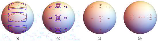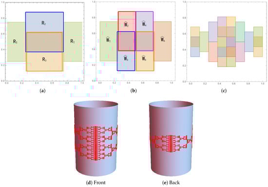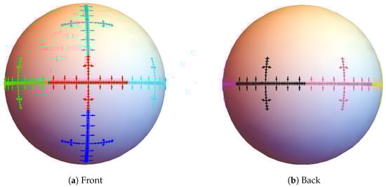 Fractals on spheres have, in fact, been studied quite extensively, especially in connection with the stereographic metric and comparison of dimensions (see []), construction of fractal functions on the sphere (see [,]), and IFSs consisting of Möbius transformations (see []). In Section 7, we study fractals generated by IRSs on spheres. Computing the dimension of an attractor becomes substantially harder, as the sphere is not locally Euclidean. Nevertheless, we show in Example 6 how to obtain the box dimension.