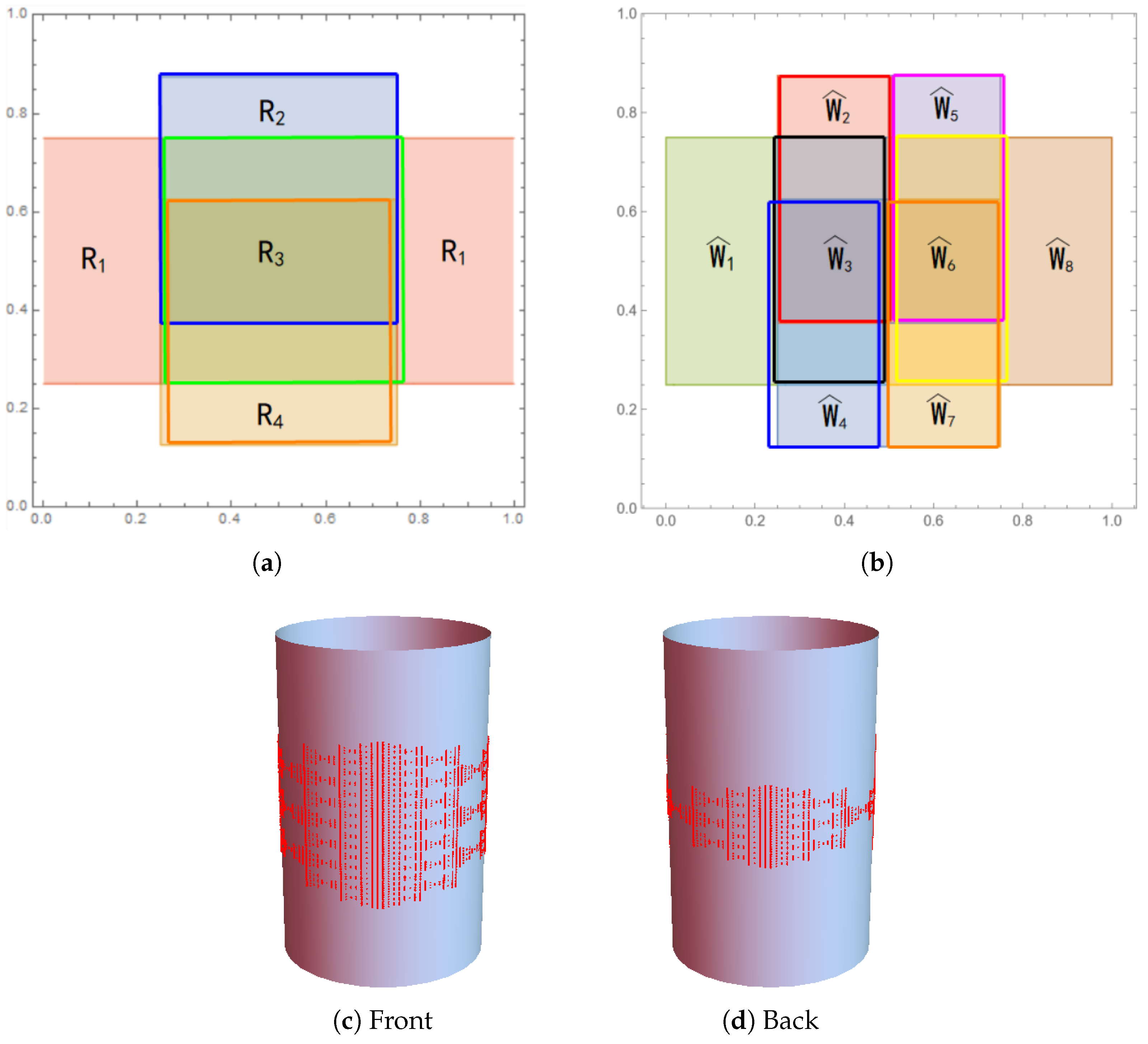 Figure 3. Figures for Example 2 with r = π / 4 . (a,b) are drawn on R 2 and shrunk by 2 π . (a) The first iteration of E 0 under { R t } t = 1 4 , where R 1 ( E 0 ) consists of the left and right rectangles, R 2 ( E 0 ) is the top square, R 3 ( E 0 ) is the middle square, and R 4 ( E 0 ) is the bottom square. (b) Vertices of the GIFS associated with { R t } t = 1 4 . (c,d) The attractor of { R t } t = 1 4 .