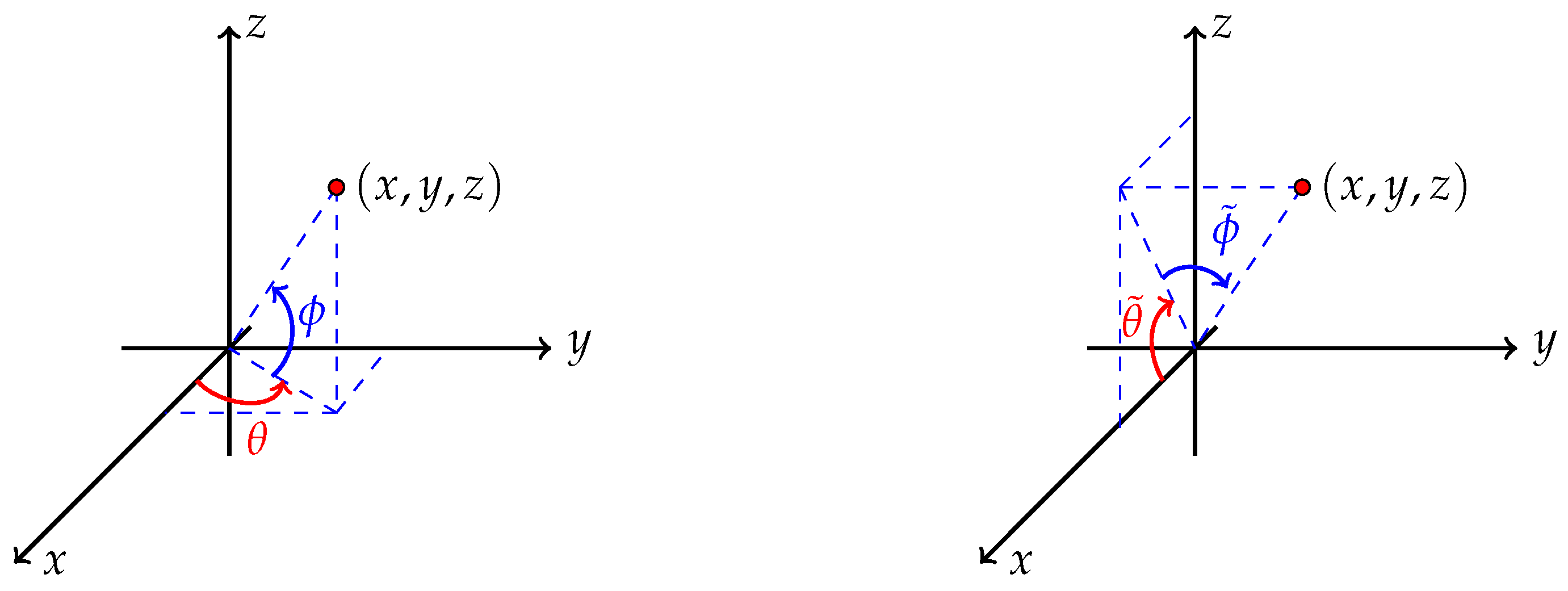 Figure 7. The polar and azimuthal angles in the two parameterizations in Example 6.
