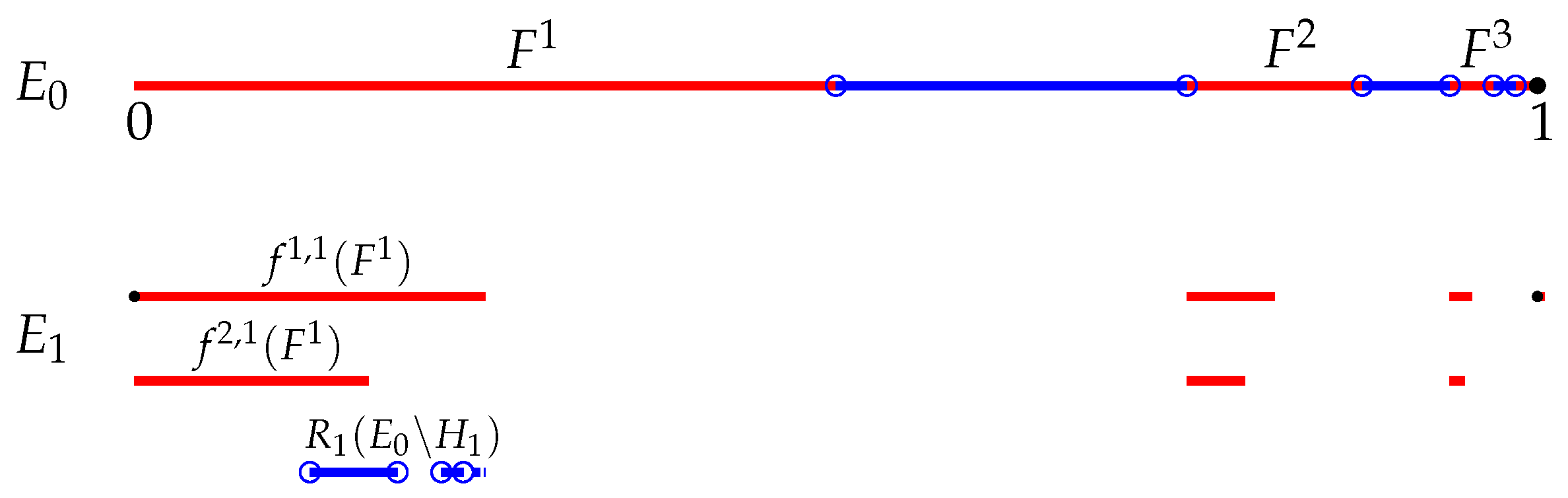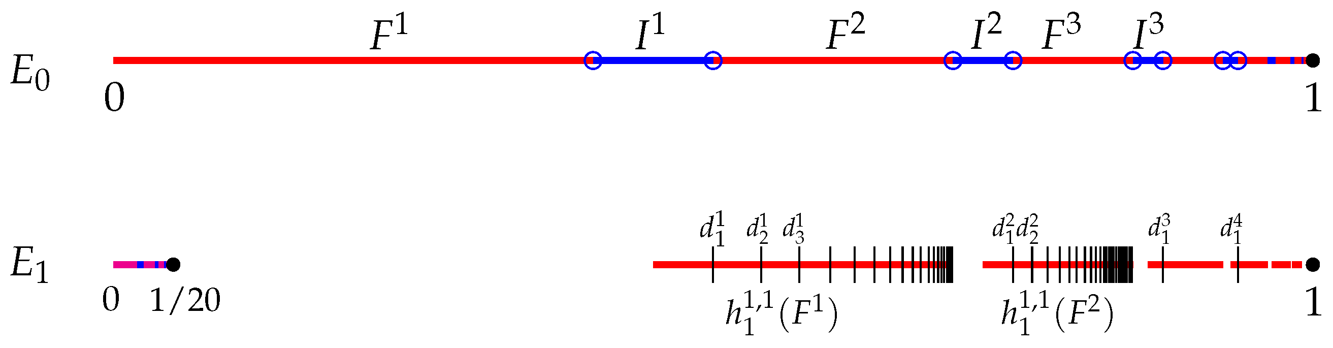 Figure A2. The sets H 1 = ( i = 1 F i ) { 1 } and E 0 H 1 = i = 1 I i in Example A6. { d j i } i , j N + represents the set of division points in E 1 . Note that for all i N + , # { d j i : j N + } = .