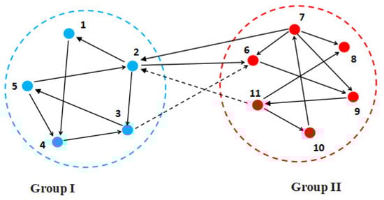 In this part, a numerical example is offered to confirm the correctness of the results derived above. A heterogeneous FODN (1) with 11 nodes and two groups is considered, the topological structure of which is shown in Figure 1. Its dynamics follows