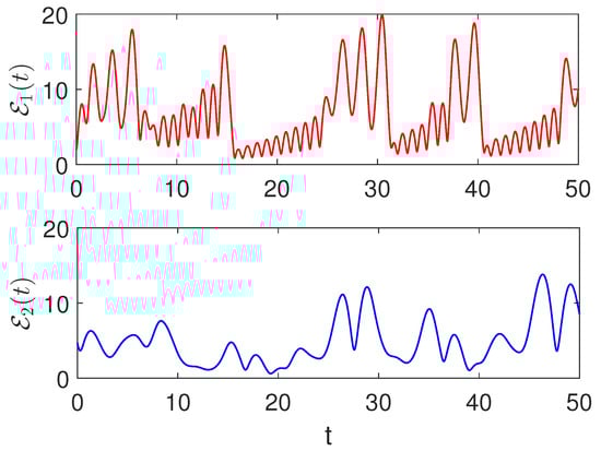 Let and , which stand for the synchronized errors of the groups and in system (40), respectively. Figure 3 shows the time evolution of and for system (40) without control, which indicates the heterogeneous FODN (40) can not reach cluster synchronization spontaneously. Figure 4 and Figure 5 depict, respectively, the time evolution of the state vectors and the adaptive control gains for system (40) under the controller (3) and (4), where . Figure 6 portrays the time evolution of and for system (40) under the controller (3) and (4). These figures clearly illustrate cluster synchronization is reached within , and the feasibility of our theoretical results is further demonstrated.