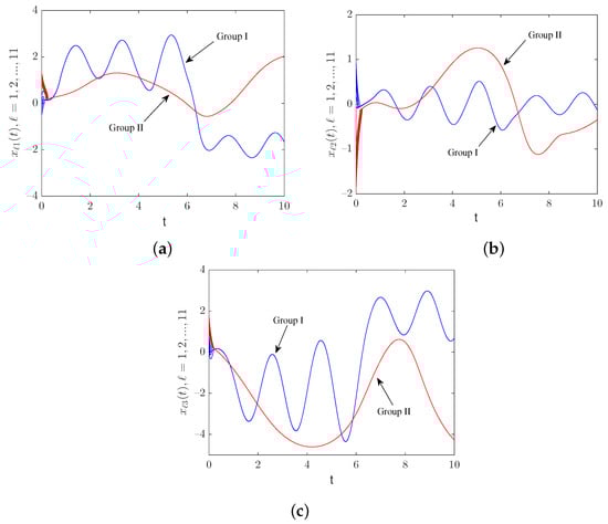 In order to analyze conveniently, for ℓ∈, we let = κ, then the function in system (19) can be represented by . Certainly, for each pair of nodes ℓ and j belonging to different groups (i.e., ≠ ), then ≠ . With the aforesaid statement, when ≠ 0, one can deduce from Equations (19)–(21) that