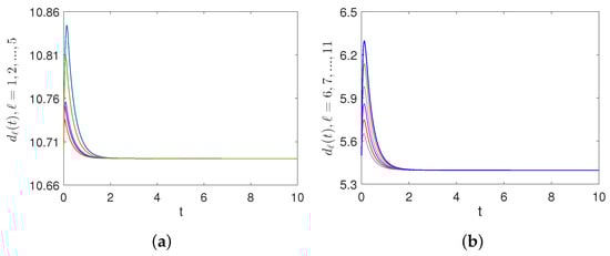 On the other hand, in the traditional state feedback control [,,,,], the control gains (or feedback strengths) are fixed and their values required to achieve cluster synchronization are usually much larger than what are actually needed. This is mainly because of the conservatism of theoretical results. In practice, small control gains mean small control effort, and thus the control gains are highly desired to be as small as possible. An effective approach to prevent the occurrence of high control gains is to adaptively adjust the control gains. It has been revealed that the adaptive control technique is a good way to obtain optimal control gains [,], by which the control parameters can update themselves using appropriate rules. Furthermore, the adaptive control technique is also effective in overcoming disturbances, uncertainties and unknown parameters of the addressed systems [,]. Hence, adaptive control schemes are more practical and cost-effective to achieve synchronization of FODNs. In [], FnT synchronization of multi-weighted complex-valued FODNs was realized via adaptive control. In [], adaptive synchronization of FO memristor neural networks with leakage delay was considered. Unfortunately, as far as the authors know, there are few studies on FnT adaptive cluster synchronization of heterogeneous FODNs, providing another motivation of our research work.