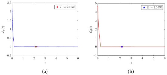 In [,,,,], some results about cluster synchronization of FODNs have been presented. However, these results are asymptotical ones; namely, its realization can be guaranteed only when the CSST goes to infinity. In contrast, in this paper the cluster synchronization can be achieved no later than , which is essential in many real-world applications, such as attitude stabilization of rigid spacecrafts [] and suppressing chaos in power systems []. In this sense, our theoretical results are more applicable than those in [,,,,].