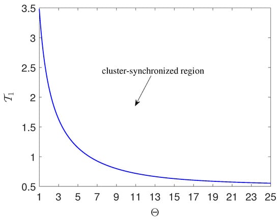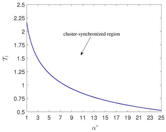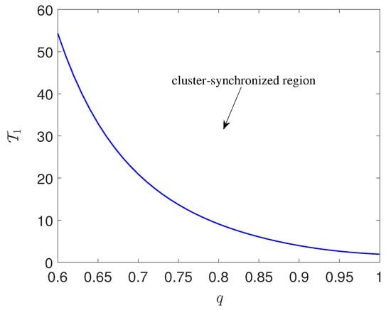 In order to reveal the influences of the order of the derivative q and the parameters , on the convergence time of cluster synchronization, we first keep other parameters unchanged and vary q from 0.6 to 1 and plot the relation curve between the estimated CSST and q in Figure 7, where the blue curve depicts the values of with different q. From Figure 7, we can observe that decreases with increasing q, suggesting the larger the q is, the smaller the CSST is, namely that the shorter the convergence time to cluster synchronization is. Next, keeping other parameters fixed, let vary within a proper range, and the corresponding is determined. As shown graphically in Figure 8, a bigger yields a smaller , which results in reaching FnT cluster synchronization sooner. Finally, we let the parameter vary from 1 to 25 and remain other parameters unchanged. By calculating the corresponding , from Figure 9, we can see that a smaller could be obtained with a bigger , manifesting the convergence time to cluster synchronization becomes shorter as the parameters () increase. That is to say, the FnT cluster synchronization can be achieved more quickly with the increasing of ().