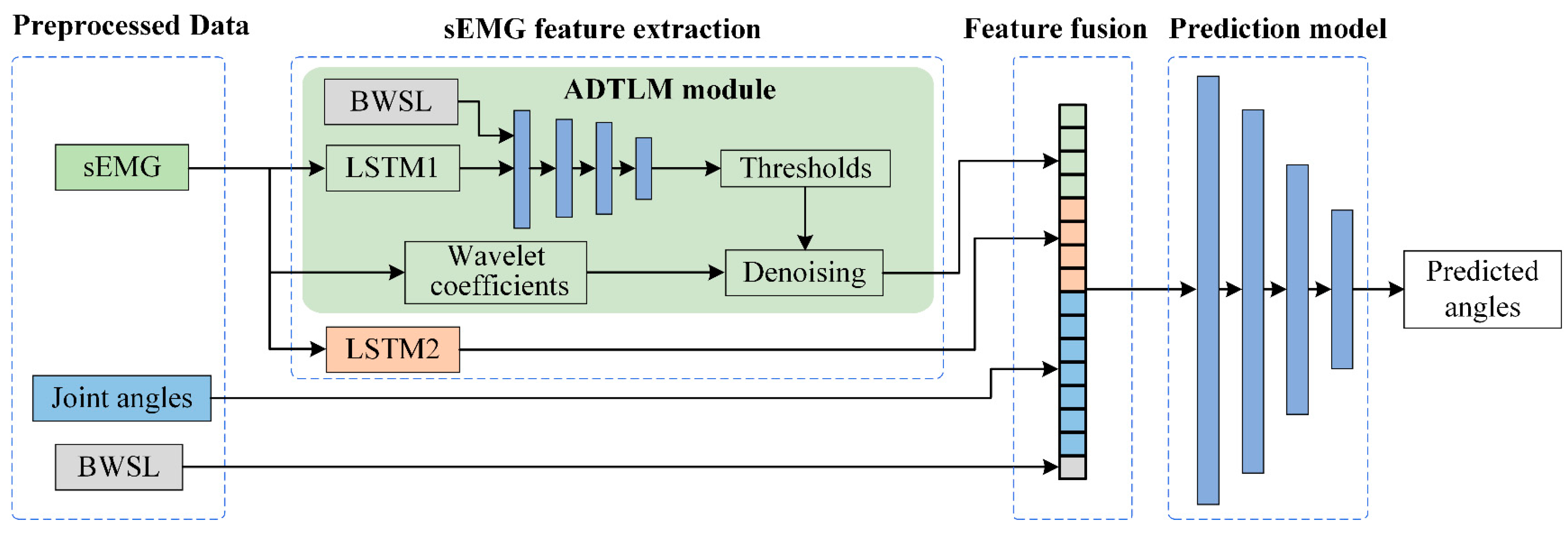 The proposed ADTLM addresses sEMG non-stationarity signals during BWST through a hybrid architecture combining LSTM-based temporal modeling and adaptive wavelet denoising. As depicted in Figure 2, the module processes preprocessed four-channel sEMG sliding window data alongside BWSL inputs.