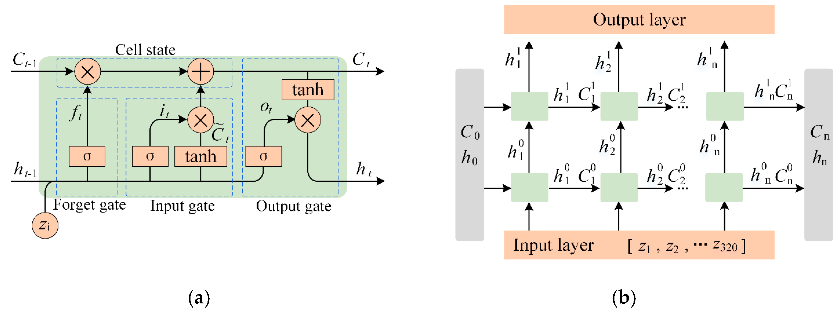 Figure 3. LSTM-based feature learning. (a) LSTM cell, (b) dual-stacked LSTM network.